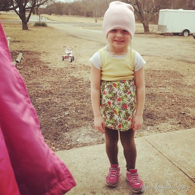 The pic with no coat – she is so pleased with herself – and her bare arms. Unbelievably cute!