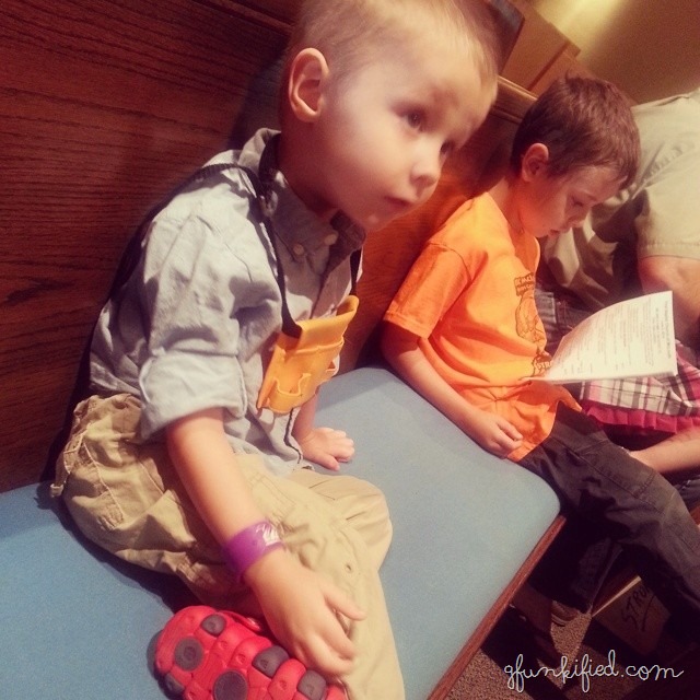 Toddler style at church, yo. Outfit complete with play tool belt around the neck, Seattle bracelet, and caterpillar Crocs.
