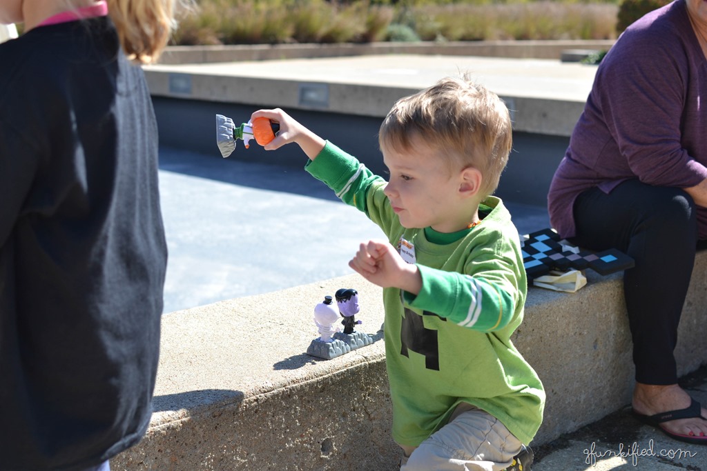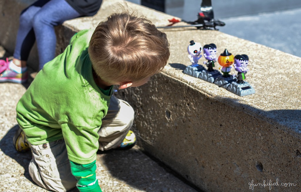 We had Henry’s birthday party this past weekend, and it was at a museum. Henry was one of the last people ready to leave. Erv, Essie and their daddy and grandparents’ went outside for a while to get some fresh air towards the end, and they were playing with little solar Halloween bobbleheads that they got from hubs’ parents.