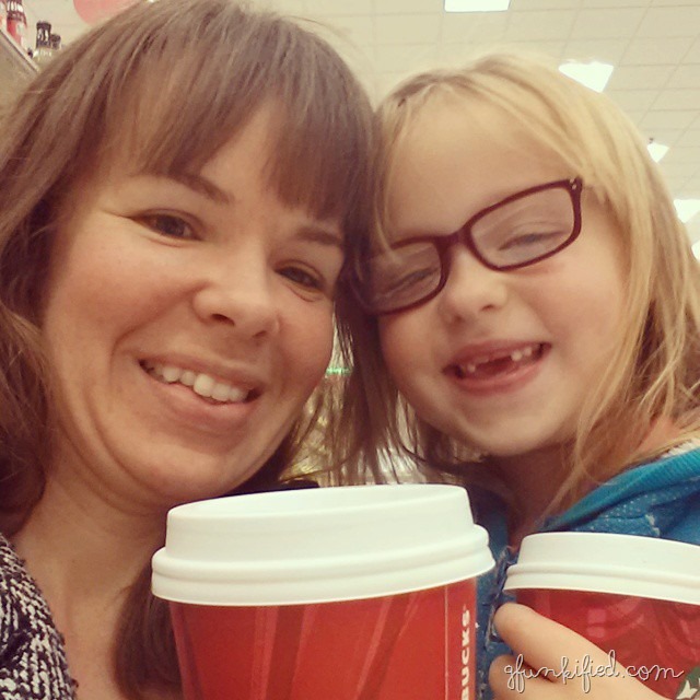 We ended up taking a van full (12-13 garbage bags) to drop off after supper on Saturday night (leaving 4-5 at home for another trip). I took her by herself since she had been such a good helper, and after unloading everything, we went to Target and celebrated with a Starbucks stop (decaf peppermint mocha for me, hot chocolate for her).